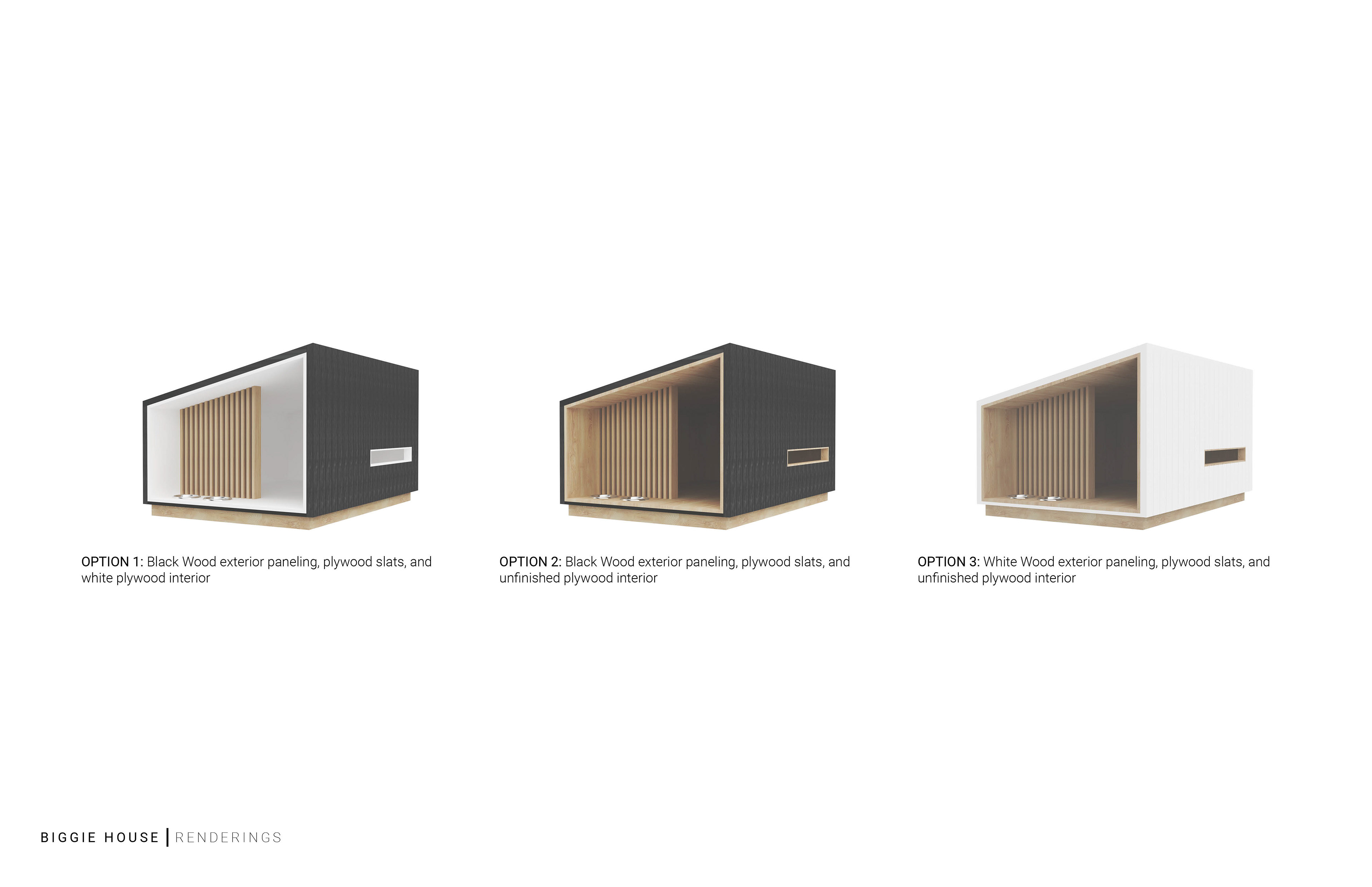 Project Brief: “Biggie house" was completed for a client who wanted to build a modern dog house. The strategy was to use a straightforward and easy construction method, while allowing the smaller details of the design to be highlighted. The modern design is brought about by the geometry of the overall volume, as well as the details of the edges and treatment of the exterior planking. Three versions were proposed to allow for aesthetic flexibility, and a construction document set was produced as well.